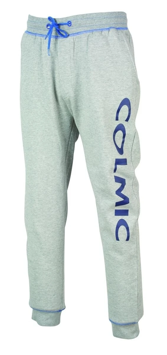 Stijlvolle grijze joggingbroek met blauw/oranje Colmic opdruk en stiksels van 60% katoen + 40% polyester. Comfortabel en ademend, ideaal voor elke vistrip.
