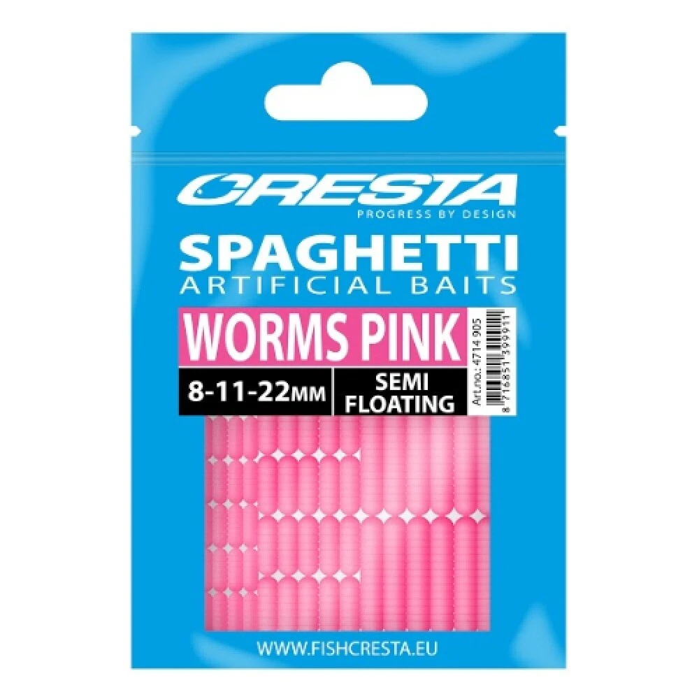 Cresta Spaghetti is een drijvend kunstaas van hoge kwaliteit. Wanneer het op de haak geplaatst wordt, ontstaat een zwevende of zeer langzaam zinkende aaspresentatie. Samen met de opvallende kleuren wordt dit aas enorm attractief voor vele vissoorten. Spaghetti kan direct op de haak gebruikt worden in één of meerdere kleuren tegelijk, maar geeft ook in combinatie met levend aas, zoals maden en wormen, extra vangkracht! Dankzij de 3 verschillende formaten in de verpakking kan Spaghetti gecombineerd worden met vele haaksoorten en aasmaten.