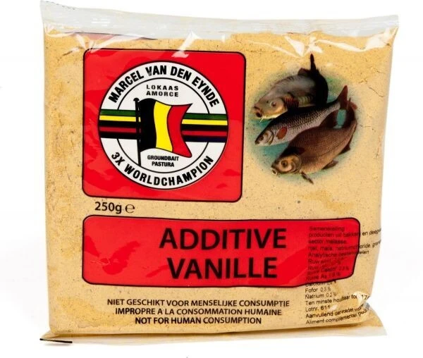 Marcel Van Den Eynde Additieven Vanille, een additief met een sterke aangename geur. Vanille is bij uitstek geschikt om toe te voegen aan ieder voer gericht op brasem en of karper alsook voor ieder visserij op grote voorns.